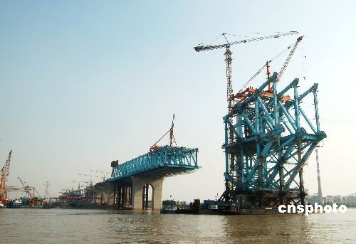 10月13日,江蘇南京,中鐵大橋局的建設(shè)者們正在京滬高速鐵路南京大勝關(guān)特大跨江大橋上對(duì)橋面鋼梁進(jìn)行架設(shè)。南京大勝關(guān)大橋是京滬高速鐵路最大的一座跨江大橋,自2006年7月開(kāi)工建設(shè)以來(lái),主橋的5號(hào)、6號(hào)橋墩,9號(hào)和10號(hào)橋墩均以完成鋼梁的架設(shè),南北引橋分段開(kāi)始對(duì)簡(jiǎn)支梁和連續(xù)梁的混凝土澆注,3300人不分晝夜奮戰(zhàn)在大橋建設(shè)第一線,預(yù)計(jì)到2009年11月30日前可完成全部橋梁的架設(shè)。中新社發(fā) 豐成 攝