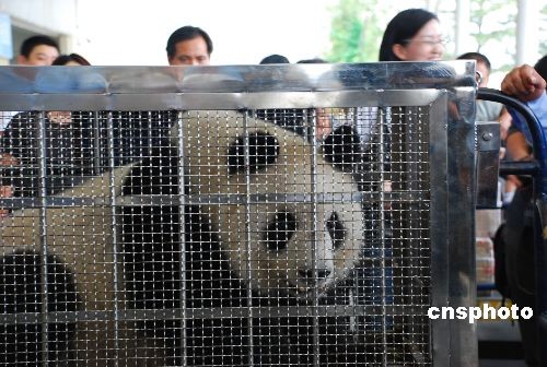 10月22日,兩只國寶級大熊貓“樂山”、“珍大”抵達(dá)杭州蕭山國際機場,立即乘車去它們的新家——浙江安吉竹博園落戶。據(jù)飼養(yǎng)員史斌遞介紹,這兩只大熊貓來自四川成都大熊貓繁育研究基地,均為雄性,每只重約100公斤,年齡都大約在兩歲半左右,相當(dāng)于人類的八九歲。它們都很好動,愛爬樹,是熊貓家族里的“運動健將”。中新社發(fā) 夏毅 攝