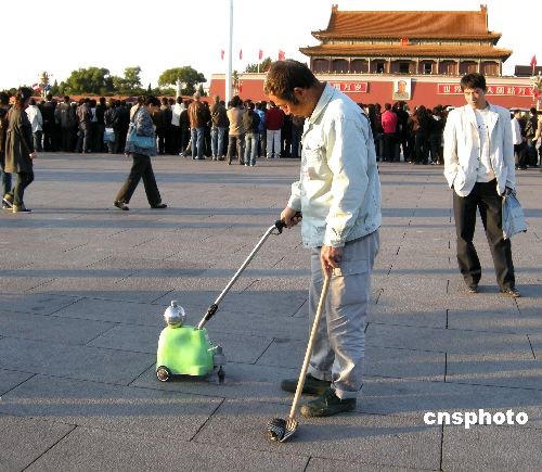 2008年10月26日,一種專門清理口香糖的袖珍電動(dòng)清潔機(jī)亮相北京天安門廣場。圖為環(huán)衛(wèi)工人使用它清洗大理石上的口香糖。中新社發(fā) 玉龍 攝