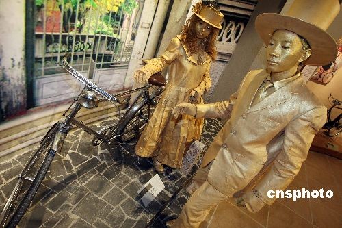 10月28日,行為藝術(shù)者在河北省霸州市新落成的華夏民間收藏館自行車博物館內(nèi)表演,表演者倚靠的是著名民間收藏家王明璽老人收藏的1910年英國(guó)生產(chǎn)的白金人牌自行車。該車只生產(chǎn)了100輛,進(jìn)入中國(guó)10輛,這是目前發(fā)現(xiàn)保存最為完好的一輛。當(dāng)日,第二屆霸州文化藝術(shù)節(jié)在河北省霸州市隆重開幕。中新社發(fā) 毛建軍 攝