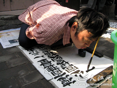 “真厲害!用手寫出這么好的毛筆字都難,何況是用頭寫!28日上午,許多市民在南昌八一大橋下圍觀一名用頭寫字的乞討者,市民贊賞之余不斷將錢投入乞討者的塑料桶里,甚至有市民花高價(jià)購買乞討者的書法。