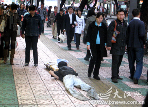 3日下午5時(shí)許,一個(gè)20出頭“高位截肢”的小伙艱難爬行在南昌市中山路人行道上,向路人訴說不幸遭遇:“一場(chǎng)車禍奪走了父母的生命,我也因這場(chǎng)車禍高位截肢!币恍┖眯氖忻褚姞睿娂娍犊饽。傍晚6時(shí)30分許,“截肢”小伙爬進(jìn)了一條小巷內(nèi),另一男子提來了一大包衣服。這時(shí),“截肢”小伙突然站了起來,換上一套時(shí)尚的休閑裝。看到記者拍照,兩人迅速消失。(文/圖劉虎記者歐陽蘇敏)