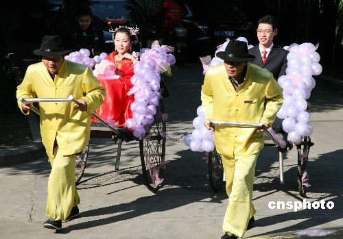 11月11日,江蘇南京的一對(duì)新人喜結(jié)良緣,新郎別出心裁地從南京夫子廟請(qǐng)來兩輛黃包車,接新娘進(jìn)門。簡樸環(huán)保型的婚慶方式既富個(gè)性又不失浪漫情調(diào)和時(shí)尚,成為街頭一道獨(dú)特的風(fēng)景。中新社發(fā) 鐘山 攝