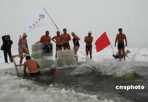 11月15日,在黑龍江黑河冬泳俱樂部成立十周年來臨之際,黑河市冬泳俱樂部會(huì)員與該市攝影家協(xié)會(huì)會(huì)員齊聚黑龍江邊。冬泳俱樂部會(huì)員們冒雪表演了精彩的跳水、蝶泳、自由泳、水上漂等項(xiàng)目,向國內(nèi)外游客展示不畏嚴(yán)寒的勇氣。攝影家協(xié)會(huì)會(huì)員則用手中的相機(jī)記錄冬泳隊(duì)員遨游冰池,以矯健的身姿挑戰(zhàn)生命極限的場景。據(jù)悉,他們將聯(lián)手共同出版畫冊,面向國內(nèi)外宣傳、推介黑河,擴(kuò)大黑河的知名度,積極推動(dòng)黑河旅游業(yè)的發(fā)展。中新社發(fā) 邱齊龍 攝