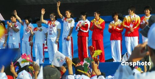2008年11月16日,第九屆中國海南島歡樂節(jié)在文昌市開幕。當(dāng)日,奧運冠軍、著名歌手、神七宇航員等眾多各類明星云集文昌,在歡樂節(jié)主會場開幕式上亮相,為歡樂節(jié)助興,傳遞節(jié)日的歡樂。中新社發(fā) 善平 攝