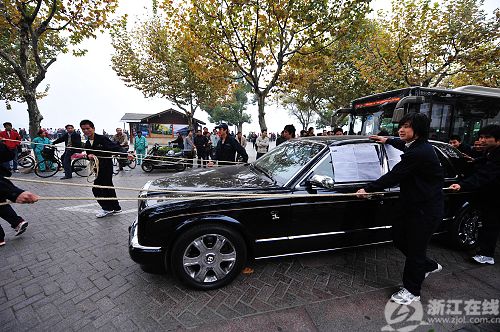 17日,杭州,20多人拉著一輛價(jià)值500多萬(wàn)的高檔豪華轎車,在西湖邊向路人展示這輛豪華轎車的名不副實(shí)。