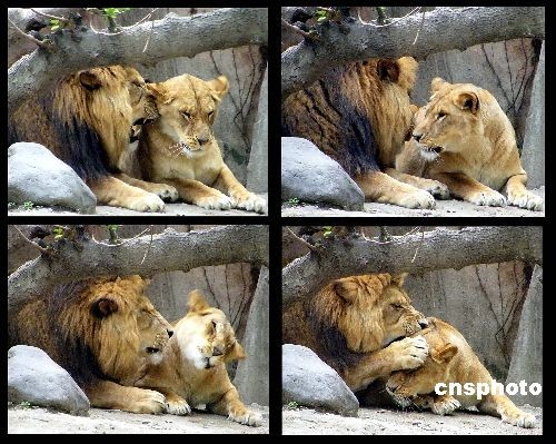 2008年11月18日,上海動物園內(nèi)的兩只獅子在互相依偎取暖。一股較強冷空氣正在氣勢洶洶南下,17日開始影響申城。來自上海氣象部門的消息,這股冷空氣將給申城帶來明顯大風降溫,過程降溫幅度6-8℃,19日和20日早晨最低氣溫將跌至5℃左右,有霜或暗霜。中新社發(fā) 井韋 攝