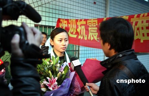 11月26日晨,武警某部貴陽(yáng)籍女警花徐一蝶和楊帆退伍還鄉(xiāng),乘火車(chē)從成都回到貴陽(yáng)。親朋好友、同學(xué)和慕名而來(lái)的人群捧著鮮花在月臺(tái)迎接這兩位在汶川大地震中做出突出貢獻(xiàn),立功受獎(jiǎng),并受到溫家寶總理接見(jiàn)的女警花。今年5月14日,徐一蝶和楊帆在救災(zāi)過(guò)程中表現(xiàn)突出,被分別授予二等功和三等功1次。中新社發(fā) 彭年 攝