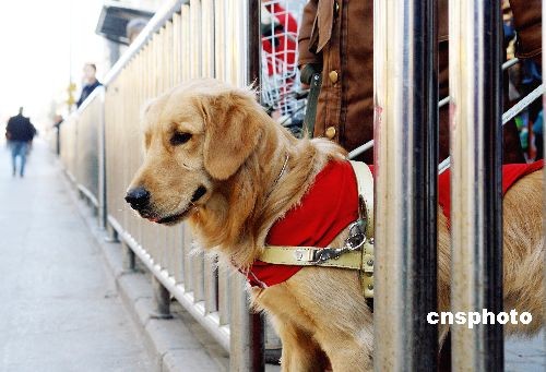 2008年11月25日,河南鄭州市首條經(jīng)過專業(yè)訓(xùn)練的導(dǎo)盲犬“福娃”在街頭做準(zhǔn)備練習(xí)。預(yù)計“福娃”年底即可上崗,也需要市民們的寬容協(xié)助。中新社發(fā) 馬健 攝