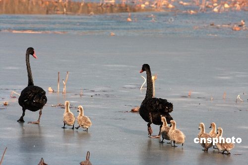 12月14日,北京圓明園,一對黑天鵝夫婦帶著8只未滿月的天鵝寶寶在享受著北京冬日溫暖的陽光。據(jù)介紹,8只小黑天鵝是11月22日出生。中新社發(fā) 鄭雄增 攝