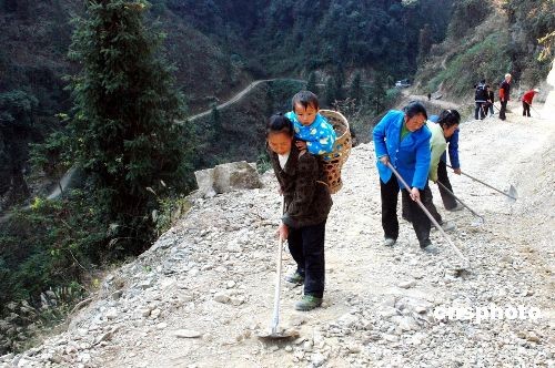12月15日,湖北恩施市新塘鄉(xiāng)河溪村一土家山寨幾十名山民利用冬閑忙修路。據(jù)了解,山寨四面環(huán)山,交通閉塞,山民出行十分不便。山寨有47戶人家,一百多人口,而且青壯年大多都背井離鄉(xiāng)外出打工。當(dāng)?shù)赜袆趧?dòng)能力的婦女、小孩和老人紛紛上山修路;除由政府出資外,當(dāng)?shù)厣矫襁自籌資金修路。目前已修通公路6.73公里。中新社發(fā) 陳地長 攝