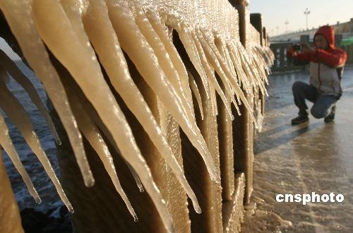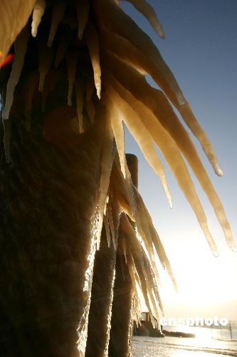 12月22日,受寒潮影響,江蘇連云港出現(xiàn)大風(fēng)降溫天氣,最低氣溫零下8攝氏度。在偏北大風(fēng)作用下,海上生成巨浪,濺在海岸邊護欄上的海水凍結(jié)成晶瑩剔透的冰凌。當(dāng)?shù)貧庀蟛块T發(fā)布黃色寒潮預(yù)警,同時發(fā)出大風(fēng)警報。中新社發(fā) 王健民 攝