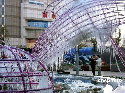 12月23日,江蘇省南京市一廣場的海豚景觀上掛滿晶瑩剔透的冰凌,呈現(xiàn)出難得一見的北國風(fēng)光。中新社發(fā) 王路憲 攝