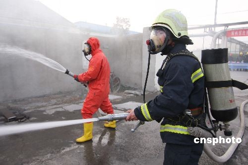 12月27日,江蘇連云港海州區(qū)人防辦聯(lián)合消防、安監(jiān)、衛(wèi)生、環(huán)保等單位在海州區(qū)德邦精細(xì)化工廠舉行學(xué)品事故處理應(yīng)急演練,旨在通過(guò)演練,提高企業(yè)節(jié)日期間突發(fā)性事故應(yīng)急處置能力。中新社發(fā) 穆道勇 攝