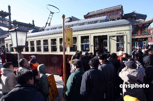 元月一日,京城市民盼望已久的前門(mén)鐺鐺車首日開(kāi)通,乘坐的市民絡(luò)繹不絕,紛紛體驗(yàn)其中的快樂(lè)。中新社發(fā) 任海霞 攝