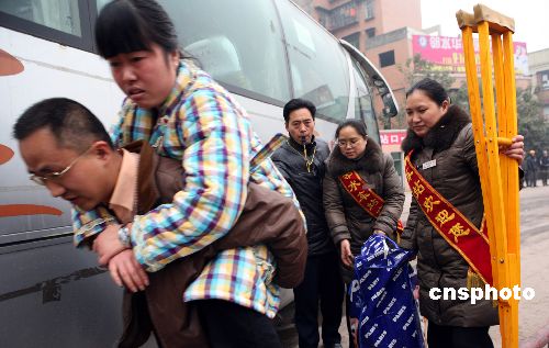2009年1月17日,四川廣安市鄰水汽車(chē)站的服務(wù)人員在熱情幫助病殘旅客上車(chē)。春運(yùn)以來(lái),四川廣安市各級(jí)客運(yùn)部門(mén)以構(gòu)建和諧春運(yùn)為宗旨,在細(xì)節(jié)和過(guò)程服務(wù)上下功夫,安排專(zhuān)門(mén)的工作人員在售票大廳、候車(chē)室及旅客上、下車(chē)區(qū)域主動(dòng)為旅客提供服務(wù),深受旅客歡迎。中新社發(fā) 邱海鷹 攝