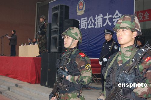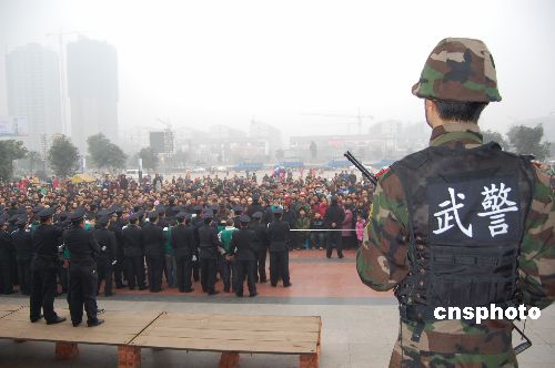 1月19日,四川岳池對(duì)縣城系列賓館盜竊案、鎮(zhèn)龍鄉(xiāng)故意傷害案、九龍鎮(zhèn)搶奪案、羅渡鎮(zhèn)販賣毒品案等15件涉嫌犯罪案件所涉及的30名犯罪閑疑人進(jìn)行了公開逮捕,吸引了近萬(wàn)名群眾觀看。中新社發(fā) 胡佐斌 攝