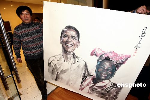 1月20日,中國著名畫家于成松大型中國畫《朗朗青空》在北京與觀眾見面。作品以奧巴馬為原型,圖中奧巴馬面掛激動的淚花,頭微微仰望遠(yuǎn)方。于成松說,想通過創(chuàng)作該幅作品,加深中美兩國人民的了解和友誼。畫家同時創(chuàng)作了以奧巴馬和他的肯尼亞奶奶為原型的作品《盈盈厚土》。中新社發(fā) 杜洋 攝