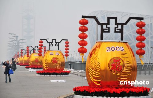 2009年1月21日,北京奧林匹克公園中軸線兩側(cè)安置的眾多巨型落地?zé)艋\為即將到來(lái)的牛年春節(jié)增添了濃濃的喜慶氣氛,也吸引了眾多游客拍照留念。中新社發(fā) 樊甲山 攝