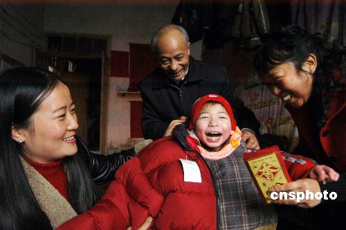 新年即將到來,四川省綿陽市民政局組織福彩中心、市梓潼兒童福利院開展“愛心助孤過年活動”,為家庭寄養(yǎng)孤兒送去慰問金、防寒服、水果、糖等年貨。圖為殘疾人蘇太金家,市民政局工作人員為寄養(yǎng)的7歲孤兒涪斌穿上防寒服。中新社發(fā) 成和平 攝