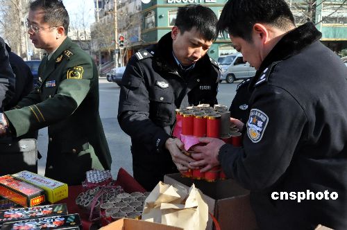 1月23日,為確保春節(jié)安全,鄭州市公安局金水分局組織治安、消防大隊、轄區(qū)派出所,全面展開對煙花爆竹違規(guī)燃放、販運和銷售煙花進行嚴(yán)格檢查。截至目前,共清查集貿(mào)市場、街道鄉(xiāng)村攤點317余處。中新社發(fā) 劉書亭 攝