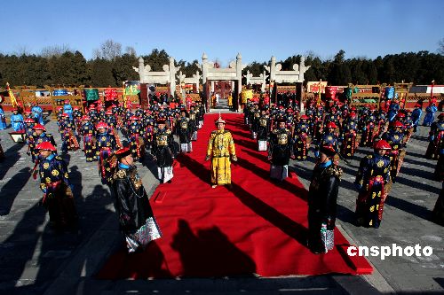 1月26日農(nóng)歷正月初一,第24屆地壇春節(jié)文化廟會如期舉行,廟會歷時8天,至2月1日截止。每年地壇廟會,地壇公園芳澤壇都會舉行場面宏大的仿清祭地表演,“皇帝”帶領文武百官、侍衛(wèi)儀仗等200余人身著盛裝祭祀,祈求地神保佑、國泰民安、風調(diào)雨順、五谷豐登,今年的祭地表演則因為“草根皇帝”的海選而備受關(guān)注。從普通市民中遴選出來的“草根皇帝”李少華正式上任,迎神送神、三叩九拜,在數(shù)百游園觀眾的注視下,黃袍加身的李少華邁著堅定的步伐,完成了一次皇家禮儀文明之旅。中新社發(fā) 富田 攝