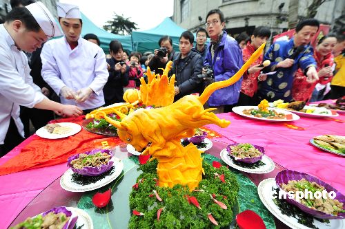 1月29日,杭州清河坊歷史街區(qū)舉辦“全牛宴”展評活動,街區(qū)內十余家老字號餐飲業(yè)名店推出與“!庇嘘P的各式創(chuàng)新菜肴,由現場市民百姓品嘗并評選出“最牛”菜肴,展示老字號企業(yè)以創(chuàng)新創(chuàng)意迎牛年牛市的自信姿態(tài)。 中新社發(fā) 李忠 攝
