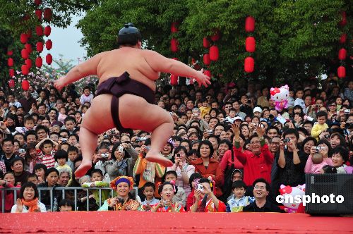 2009年2月1日,日本相撲手為廣大游客表演。第二屆廣州(番禺)櫻花文化節(jié)自1月26日在大夫山森林公園開幕以來,每天吸引數(shù)萬游人;顒映擞墟弊湘碳t的櫻花觀賞外,還有豐富多彩的表演。本屆櫻花文化節(jié)將于3月15日閉幕,歷時49天。中新社發(fā) 盤石 攝