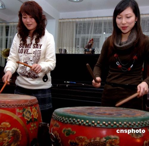 二月四日晚,二名女性觀(guān)眾在福建首家私人樂(lè)器博物館——福州宜天樂(lè)器博物館即興演奏“中古佳麗”民族大鼓。由福建一著名樂(lè)器收藏家創(chuàng)辦的福建首家私人樂(lè)器博物館共收納古今中西樂(lè)器逾千件,惹人流連。 中新社發(fā) 劉可耕 攝