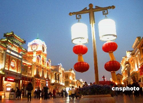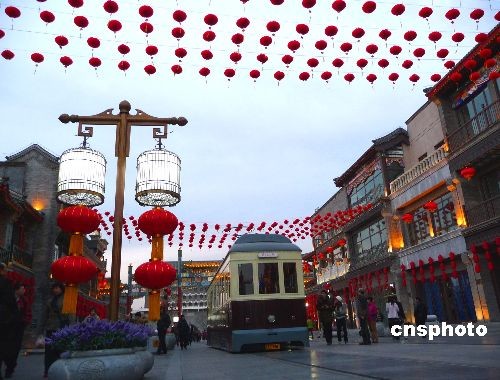 2009年2月7日(農(nóng)歷正月十三),大紅燈籠懸掛北京前門大街,迎接元宵佳節(jié)到來。據(jù)悉,2月9日(農(nóng)歷正月十五),前門大街將舉行元宵節(jié)踩街活動,來自北京、河北、山東的花會隊,將從正陽門箭樓南側和前門五牌樓之間被彩綢包圍的“儀式場”出發(fā)。16只南獅和北獅將為大隊人馬開道,隨后,中幡、旱船、二魁摔跤、地秧歌、鼓子秧歌等將依次向珠市口行進。中新社發(fā) 玉龍 攝