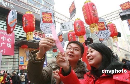 2月8日,人們?cè)诒本┲嘘P(guān)村競(jìng)猜謎語。為迎接元宵佳節(jié),北京中關(guān)村舉行元宵燈謎會(huì),用“電腦”、“相機(jī)”、“鼠標(biāo)”、“手機(jī)”等造型懸掛的燈謎,吸引了不少市民駐足猜謎。中新社發(fā) 陳曉根 攝