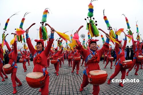 2月10日,在有“天下第一鼓”美稱的河北藁城市,上萬名當?shù)厥忻癜选皯?zhàn)鼓”搬到了廣場上,擊鼓狂歡慶新春。中新社發(fā) 鮑榮華 攝