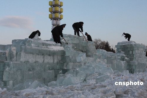 2月28日,施工人員在牡丹江市城區(qū)冰堡旅游景點拆除融化的冰雕作品!傲⒋骸边^后,素有“雪城”之稱的黑龍江省牡丹江市氣溫回升較快,城區(qū)內(nèi)的各大冰雪旅游景點的冰雪作品開始融化,失去寒冬里的風(fēng)采。從當(dāng)日起,城區(qū)冰雪旅游景點管理部門對融化的冰雕作品進行拆除。中新社發(fā) 莊文斌 攝