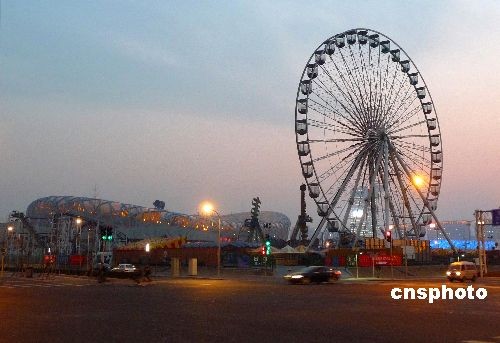 2009年3月7日傍晚,北京奧林匹克公園,巨大的摩天輪與鳥巢交相輝映。據(jù)悉,鳥巢旁的首個嘉年華目前正在加緊調(diào)試中,預計將于3月中旬開業(yè)迎客。 中新社發(fā) 玉龍 攝