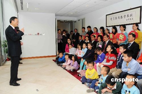當(dāng)?shù)貢r(shí)間三月十二日,正在美國(guó)訪問(wèn)的中國(guó)外交部部長(zhǎng)楊潔篪來(lái)到中國(guó)駐美大使館視察中國(guó)250多家駐外使領(lǐng)館中的一所學(xué)校——駐美使館陽(yáng)光學(xué)校。楊潔篪在和學(xué)校孩子們交談時(shí)鼓勵(lì)他們學(xué)說(shuō)中國(guó)話,學(xué)寫(xiě)中國(guó)字,學(xué)做中國(guó)人,并為陽(yáng)光學(xué)校題寫(xiě)校訓(xùn):“愛(ài)國(guó)勵(lì)志勤學(xué)奉獻(xiàn)”。圖為楊潔篪在和陽(yáng)光學(xué)校老師和孩子們交流中。 中新社發(fā) 邱江波 攝