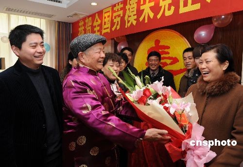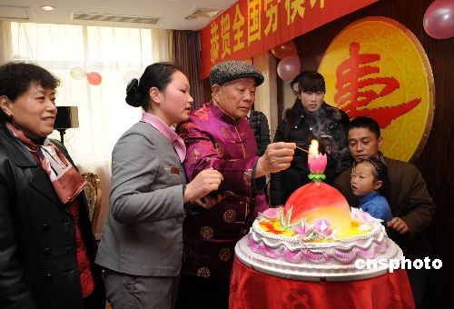 3月13日,安徽六安市為全國勞動模范宋克臣祝賀80壽辰。宋克臣1948年參加革命,1958年,他發(fā)明轟動全國的自動售糧器;2008年汶川地震發(fā)生后,他把自己發(fā)明的《高層建筑應(yīng)急逃生裝置》專利無償捐獻(xiàn)給國家。60年來,宋克臣通過刻苦自學(xué),共發(fā)明創(chuàng)造45項各類實用技術(shù),成為遠(yuǎn)近聞名的勞模發(fā)明家。中新社發(fā) 陳超平 攝