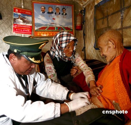 3月18日,武警西藏總隊(duì)醫(yī)院派出專家巡診團(tuán),來到拉薩市當(dāng)雄縣格達(dá)鄉(xiāng)羊易村10.6地震災(zāi)區(qū),對因在地震中受傷的10余名傷員進(jìn)行跟蹤治療,并為其他災(zāi)民進(jìn)行了春季防病知識宣講及診斷治療。 中新社發(fā) 張權(quán) 攝