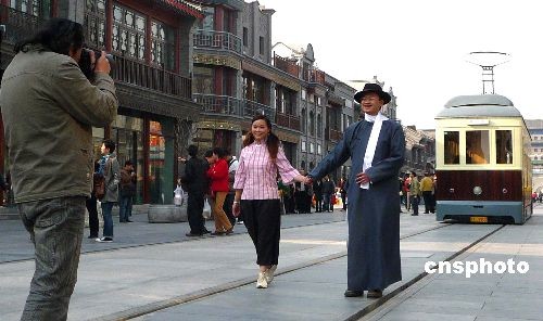 圖:年輕情侶身穿懷舊服飾前門大街留影
