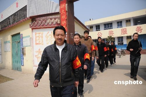 3月25日,兩支主要由返鄉(xiāng)農(nóng)民工和大學(xué)生村官組成的治安巡邏隊奔赴河南省南陽市臥龍區(qū)武候街道的城鄉(xiāng)“戰(zhàn)場”。去年以來,武候街道共吸納150名返鄉(xiāng)農(nóng)民工和大學(xué)生村官,組成城鄉(xiāng)治安巡邏隊,對城市社區(qū)和農(nóng)村鄉(xiāng)鎮(zhèn)實(shí)行24小時不間斷治安巡邏。巡邏隊員每人每月可獲得300元的崗位補(bǔ)助,而且,周六、周日和節(jié)假日還可享用二至三倍的加班費(fèi)。 中新社發(fā) 付海厚 攝