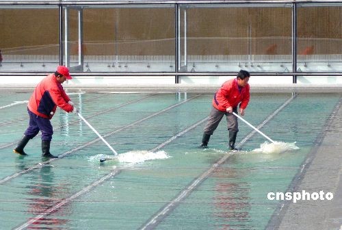 2009年3月26日,北京國家大劇院旁,兩名保潔員在認(rèn)真清理景觀池玻璃上的積水,進(jìn)行正常的維護(hù)保養(yǎng)。中新社發(fā) 玉龍 攝