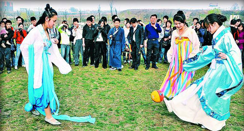3月29日,農(nóng)歷三月三上巳節(jié),是中國(guó)傳統(tǒng)的“女兒節(jié)”。西安一群愛(ài)好漢服的女子來(lái)到唐城墻遺址公園的吟詩(shī)壇里秀風(fēng)采。幾個(gè)女孩子以古代名畫(huà)《女史箴圖》為藍(lán)本,以情景劇形式表現(xiàn)中國(guó)古代貴婦的妝容文化。旁邊還配有專業(yè)人士指導(dǎo)并現(xiàn)場(chǎng)解說(shuō),向大家介紹中國(guó)古代婦女的妝容。隨后,她們又到曲江池遺址公園湖邊,舉行祓禊祈;顒(dòng),并踢起了球。