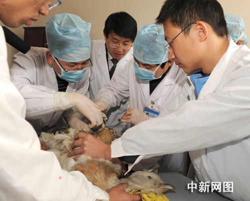 4月16日上午,河北河間市尊祖莊鄉(xiāng)前申魯村村民魏貴華救助了一只受傷的國家一級保護(hù)動物大鴇,隨后志愿者將受傷大鴇接到河北滄州市野生動物救護(hù)中心。經(jīng)初步檢查,發(fā)現(xiàn)大鴇右腿骨折,在骨折處上方還有一個(gè)巨大腫瘤。為盡最大努力挽救受傷大鴇的生命,17日,動物救護(hù)中心請來了滄州市中西醫(yī)結(jié)合醫(yī)院李國良等3位骨科專家義務(wù)為大鴇診療。經(jīng)過近3小時(shí)的手術(shù),專家摘除了一個(gè)直徑8cm,重達(dá)200g的巨大腫瘤,并切除了壞死的斷肢。