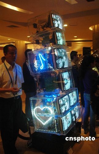4月17日晚,海南博鰲,博鰲亞洲論壇2009年年會舉行了一場亞洲當代藝術精品展覽,這是該論壇首次開設亞洲當代藝術展覽。此次展覽由博鰲亞洲論壇與藝美基金(Artmia)共同主辦,由中國美術館館長范迪安出任藝術總監(jiān)。展出中日韓等亞洲多國優(yōu)秀藝術家的代表性作品二十余件,其中包括張曉剛的油畫《失憶》、曾梵志的版畫《獅子》和油畫《風景》、以電腦影像進行藝術創(chuàng)作的繆曉春的《水起源》,以及越南藝術家阮初芝淳、日本影像藝術先驅澤拓、韓國新媒體大師白南準等人的多件影像作品。圖為展出的韓國新媒體大師白南準的作品。中新社發(fā) 尹海明 攝