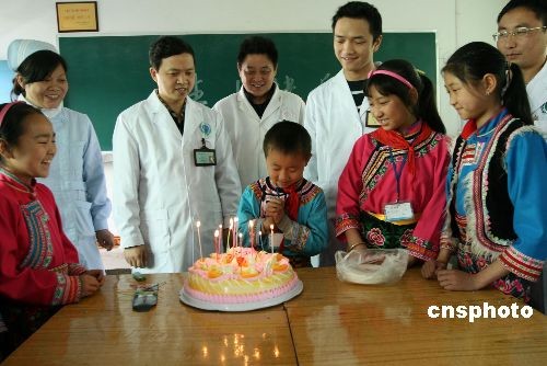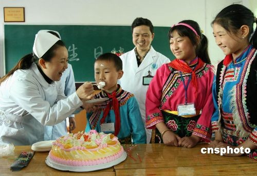 4月29日,四川災區(qū)汶川綿虒小學在廣安異地復課學生張翔迎來11歲生日,曾在2008年“5.12”汶川地震發(fā)生后當日奔赴汶川綿虒鎮(zhèn)救死扶傷的廣安區(qū)人民醫(yī)院醫(yī)生護士專程來到學校,為張翔舉辦生日派對,并送上生日大蛋糕。中新社發(fā) 廖小兵 攝