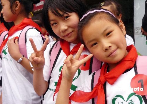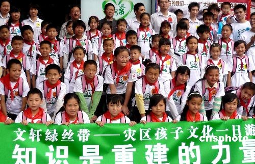 5月7日,在汶川地震一周年前夕,來(lái)自汶川災(zāi)區(qū)的百名小朋友在成都參加 “文軒綠絲帶--災(zāi)區(qū)孩子一日游”啟動(dòng)儀式,是次活動(dòng)以“知識(shí)是重建的力量”為主題,向?yàn)?zāi)區(qū)小朋友捐贈(zèng)兒童讀物,通過(guò)綠絲帶一日游活動(dòng),使災(zāi)區(qū)少年兒童健康快樂(lè)生活、樹(shù)立堅(jiān)強(qiáng)、堅(jiān)韌積極向上的生活態(tài)度,體驗(yàn)書(shū)與愛(ài)的力量。圖為參加“文軒綠絲帶--災(zāi)區(qū)孩子一日游”啟動(dòng)儀式的災(zāi)區(qū)小朋友。中新社發(fā) 錢(qián)興強(qiáng) 攝