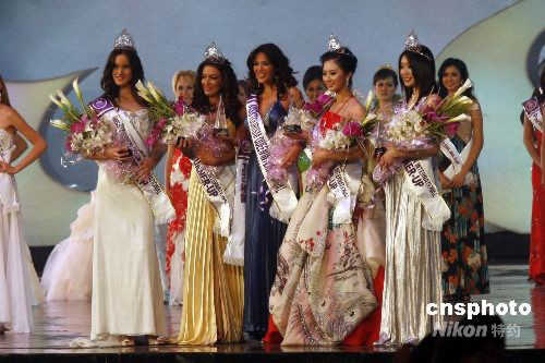 4月10日晚,2008國際旅游小姐冠軍總決賽暨頒獎(jiǎng)晚會(huì)在河南鄭州隆重舉行。秘魯小姐Silvia Vanessa (中)獲得本年度國際旅游小姐冠軍。代表中國參賽、浙江傳媒大學(xué)一年級(jí)的大學(xué)生童鶴(右二)和加拿大小姐Sahar Biniaz (左二)分獲亞軍和季軍。中新社發(fā) 慎重 攝