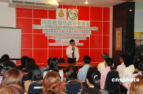 6月16日,泰國(guó)孔敬大學(xué)孔子學(xué)院與泰國(guó)孔敬府教育辦公室合作舉辦的第六屆漢語教師培訓(xùn)班在泰國(guó)開班。這是孔敬大學(xué)孔子學(xué)院和孔敬府教育辦公室在今年的第二次合作,是一次特殊的漢語教師培訓(xùn)。以往的教師培訓(xùn)都是在假期進(jìn)行,應(yīng)孔敬府教育辦公室對(duì)提高教師們的漢語水平的迫切需要,孔子學(xué)院在新學(xué)期剛開始就為孔敬府各區(qū)縣的中小學(xué)教師開設(shè)教師漢語培訓(xùn)課程。來自孔子學(xué)院的領(lǐng)導(dǎo)、老師、志愿者,孔敬府教育辦公室領(lǐng)導(dǎo)及孔敬府各區(qū)縣19所中學(xué)校的40名教師參加了這次開學(xué)典禮。中新社發(fā) 顧時(shí)宏 攝