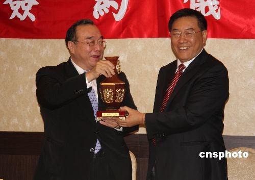 六月八日,中國僑聯(lián)主席林軍與僑聯(lián)總會理事長簡漢生在臺北“上海鄉(xiāng)村”簽署加強(qiáng)合作交流協(xié)議書。雙方約定將定期集合雙方海內(nèi)外組織,進(jìn)行專題活動,以增進(jìn)了解互信,交換工作經(jīng)驗;經(jīng)常召開與僑聯(lián)工作相關(guān)的研討會,以推動僑教、經(jīng)貿(mào)、文化、體育等方面的交流;經(jīng)常辦理雙方組織成員及會員的互訪交流,以深化彼此感情、友誼與共識。圖為簽約之后,林軍主席(右)向簡漢生先生(左)贈送禮品。中新社發(fā) 耿軍 攝