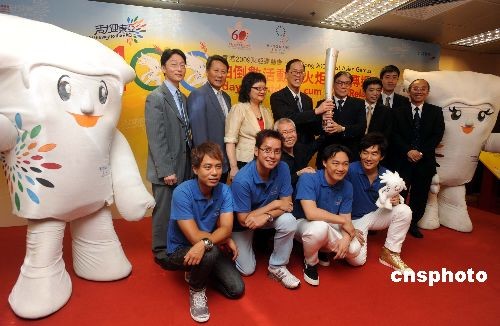 七月二十三日,香港二零零九年東亞運(yùn)動(dòng)會(huì)為一百日倒數(shù)活動(dòng)及火炬接力傳遞活動(dòng)舉行記者會(huì),公布相關(guān)事宜。香港民政事務(wù)局局長曾德成、東亞運(yùn)動(dòng)會(huì)籌備委員會(huì)主席霍震霆于會(huì)上手持運(yùn)動(dòng)會(huì)傳遞的火炬,并與出席嘉賓及運(yùn)動(dòng)會(huì)吉祥物合照。中新社發(fā) 鄧慶樂 攝