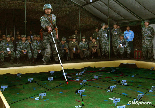 解放軍濟(jì)南軍區(qū)“前鋒-2009A”軍事演習(xí)于10月21日17時(shí)在某合同戰(zhàn)術(shù)訓(xùn)練基地打響,這次陸空軍聯(lián)合火力打擊實(shí)兵實(shí)彈演習(xí)將持續(xù)20余個(gè)小時(shí),當(dāng)晚國防大學(xué)防務(wù)學(xué)院、空軍指揮學(xué)院的外軍學(xué)員,以及英國、以色列、土耳其、巴基斯坦等國軍事觀察員親臨現(xiàn)場觀摩了后勤保障戰(zhàn)斗準(zhǔn)備、自行榴彈炮占領(lǐng)陣地、裝甲車輛“摸黑”開進(jìn)等戰(zhàn)斗要素。中新社發(fā) 宋吉河 攝